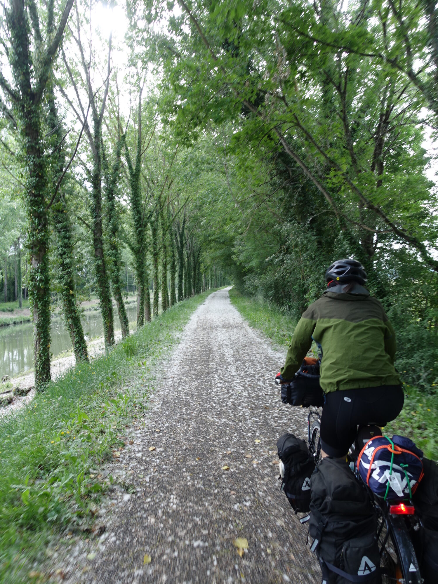 Partant de Carcassonne sous un ciel gris et pluvieux, nous évitons sciemment la route du canal non pavée. Nous avons entendu des histoires d’horreur de vase/boue collant aux roues. Non merci! Choix judicieux, car quand nous retournons sur le canal à la frontière de la Haute-Garonne où commence le canal pavé, nous croisons Jean-Charles qui était aussi à VéloDodo durant notre pause à Carcassonne. Celui-ci est retourné sur le canal un peu trop tôt et y a goûté. Il décide de faire route avec nous (à notre vitesse pépère) et restera avec nous jusqu’à Toulouse. En soirée, nous jaserons autour d’une bouteille de vin sous le bloc sanitaire protégé de la pluie. Nous apprenons aussi que nous sommes dans la période des Saints de glaces où il a la possibilité de gel au sol en mai. Voilà pourquoi il fait froid et pluvieux!