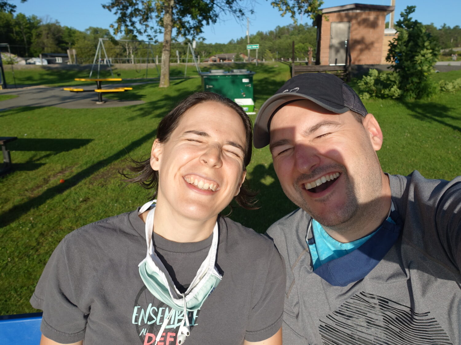 On ne peut commencer un voyage canadien sans profiter des attractions locales : étant arrivé plus tard que prévu hier soir, le seul restaurant à distance de marche et toujours ouvert était Tim Hortons . Ce matin, grâce à un déjeuner des champions composé de left overs, d’un café Tim réchauffé et 4-5 Tim bits, on réussit un petit miracle : partir exactement à l’heure prévue! Une première en 8 ans. On quitte donc Sudbury vers l’ouest pour 80 km jusqu’à Espanola. On utilise le trajet du Great Lakes Waterfront trail, et on suit l’autoroute 17 en prenant des petites routes secondaires et tertiaires vraiment sympathiques et pratiquement désertes. C’est vraiment une superbe journée, température idéale, paysages très charmants. On emprunte aussi notre 2e chantier de construction en deux jours, mes talents de “mapping” sont toujours à point!