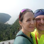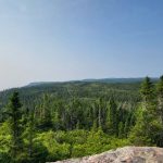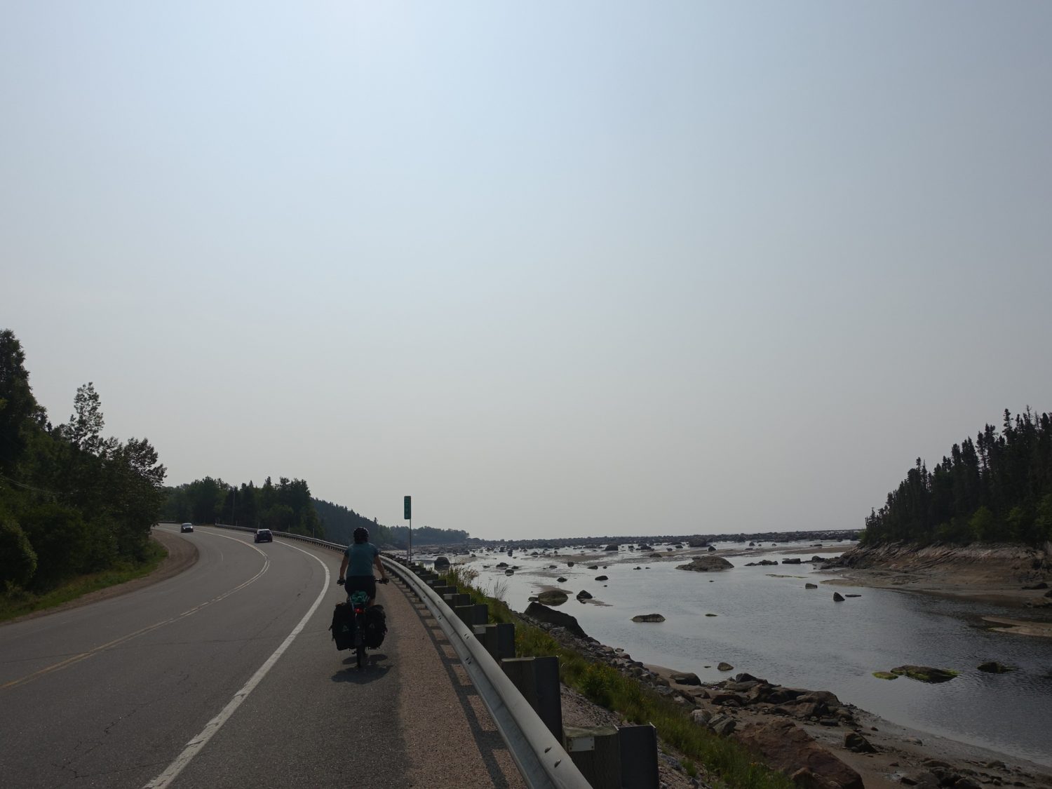 La voici l’étape difficile de notre voyage, près de 100km et toutes les côtes entre Baie-Comeau et Baie-Trinité. Réveil très matinal (selon moi) afin de ne pas être trop pressé en fin de journée, on entame d’abord la montée vers le sommet de St-Pancrace où la halte routière offre une vue sur le Fjard, et on y passe un bon moment. La halte marque également la fin de la véloroute des baleines officiellement, quoiqu’on n’ait vraiment pas remarqué de différence entre avant et après sur la route. On poursuit notre chemin vers Franquelin, et on croise de nombreuses rivières, lacs et baies et les paysages sont spectaculaires. Petit stop à la boulangerie pour acheter des galettes à la mélasse et faire une première pause lunch. On continue ensuite à monter vers Godbout, on y fera un autre stop pour notre deuxième pause lunch, très bien installée près de l’entrée de la ZEC. La suite du chemin a été particulièrement pénible. En effet, la 138 ne passe pas directement sur la côte pour rejoindre Baie-Trinité, et on a dû subir pendant environ 25 km la chaleur de l’après-midi avec le soleil qui plombe sur notre tête, aucune brise du large et la route qui monte toujours. Enfin, après la dernière montée de la journée, on aperçoit au loin de nouveau le Saint-Laurent! Il ne restait maintenant que 20 km à descendre pour rejoindre Baie-Trinitée, et une crème glacée bien méritée.