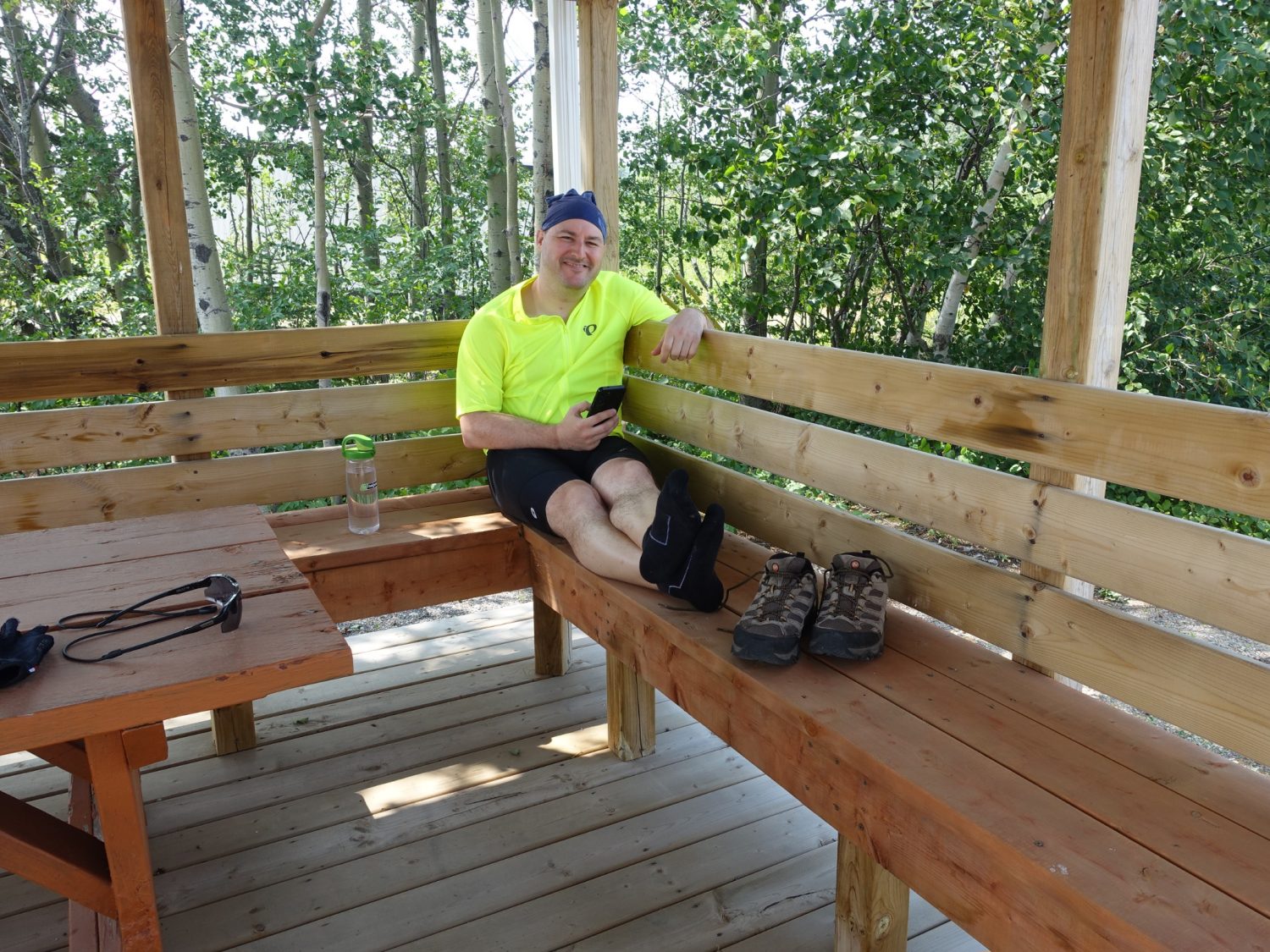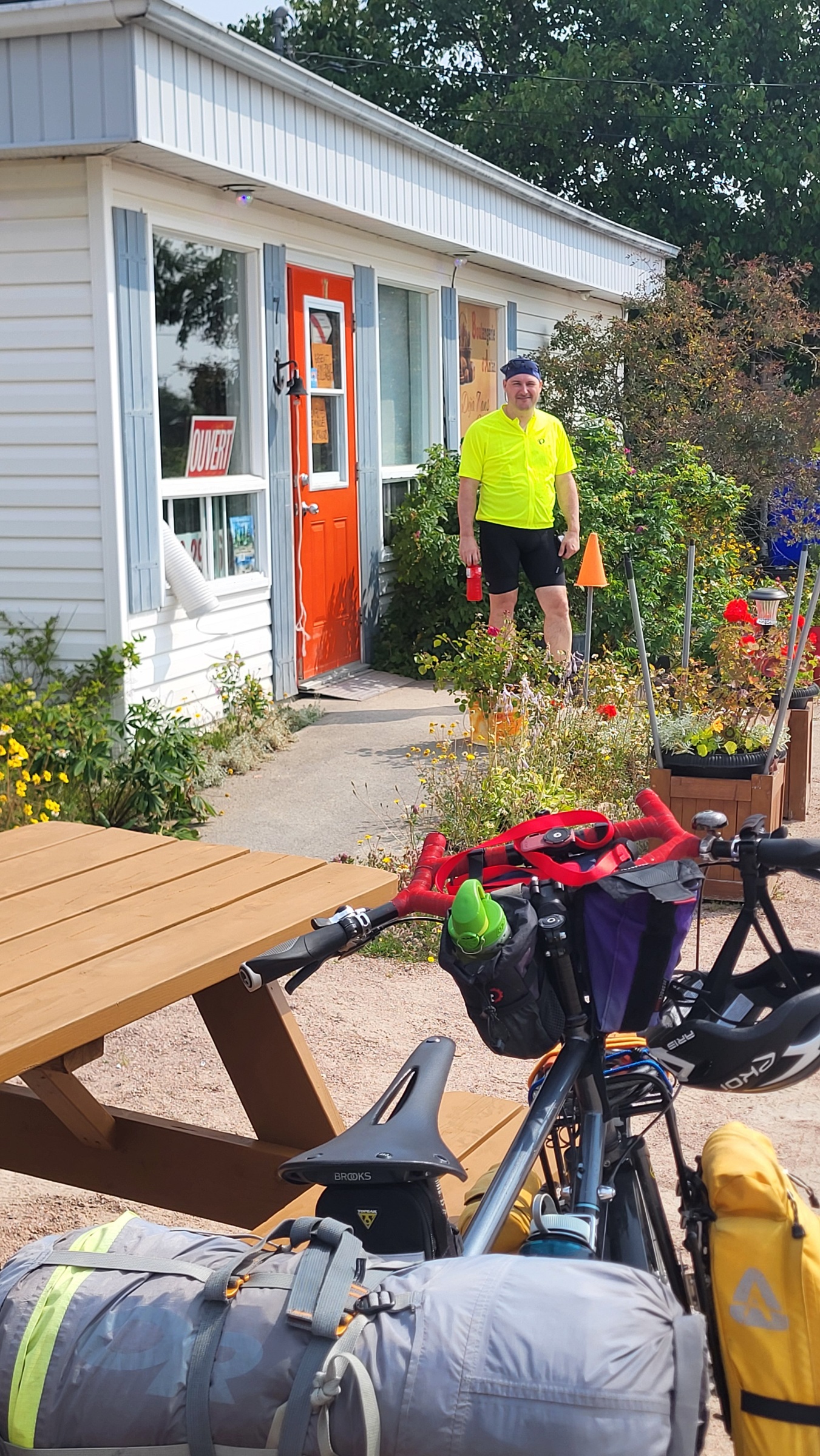 P.S. Marc a maintenant une crevaison lente, et on a dû s’arrêter quelques fois pour regonfler son pneu, puisque le changer semblait être trop d’effort aujourd’hui… Un problème pour demain quoi.