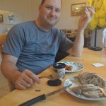 Aujourd’hui commence la partie difficile du voyage. On suit tout d’abord le littoral au pied des falaises avec une belle route plate, un fort vent dans le dos. C’est vraiment magnifique, je recommande à tous les cyclistes. On croise Pascal, Jacynthe et JL (en voiture… Pfft) qui se dirige en sens inverse et faisons une petite pause supplémentaire pour jaser. On arrive rapidement au Cap de la Madeleine pour le lunch et une petite visite du phare. En repartant une pluie légère tombe, et on commence à monter. Et monter, et monter encore dans la brume. Plusieurs tournants nous donnent espoir qu’on est arrivé au plus haut point mais… non. Après environ 1 h 30, avec quelques pauses, on commence à descendre ! Wooo ! On arrive finalement à Grande Vallée, affamés et prêts pour un repos avant de souffrir encore plus demain, selon le GPS.