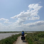 On repart en suivant la Sèvre niortaise sur les chemins de halage transformés en pistes cyclables pour rejoindre la Vélodyssée sur la côte atlantique. On croise plusieurs endroits de villégiatures sur le chemin, et étant un long week-end, c’est plein de touristes qui viennent profiter du beau temps et de l’eau. On se promène entre les dunes de sable avant de prendre une journée repos dans un camping, et un petit train pour rejoindre Nantes, puisque j’ai refilé mon rhume d’y a quelques jours à Marc et qu’il n’est pas trop « top shape ».