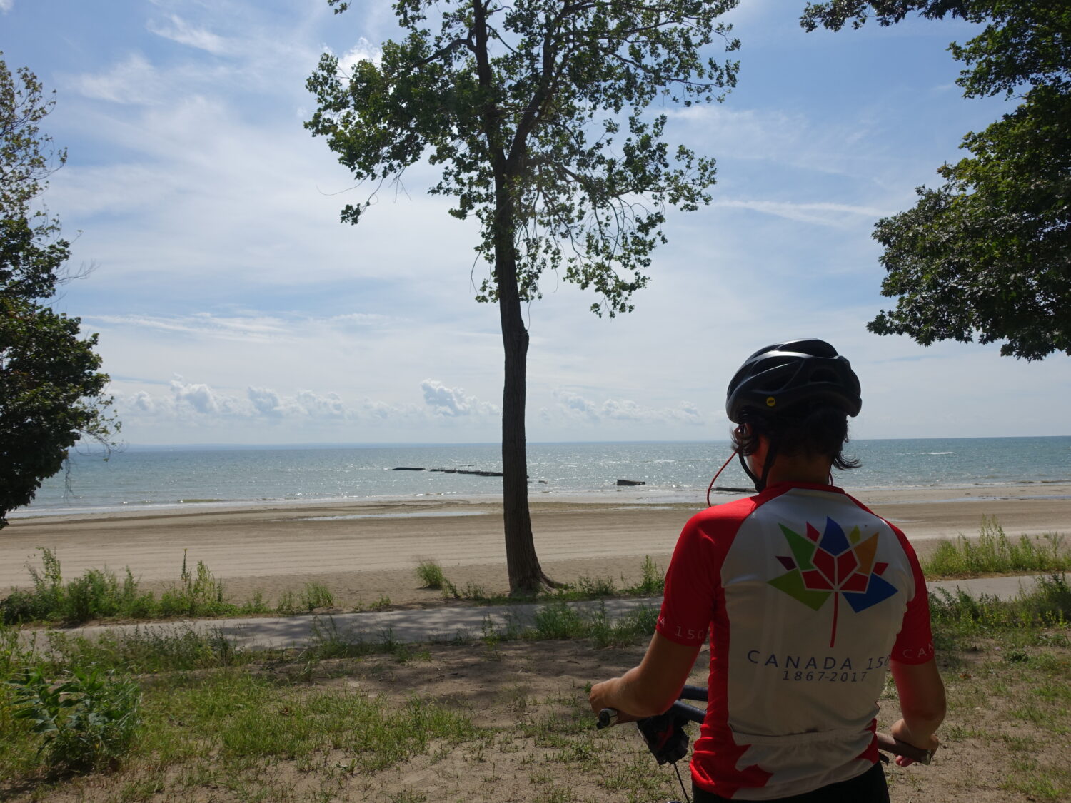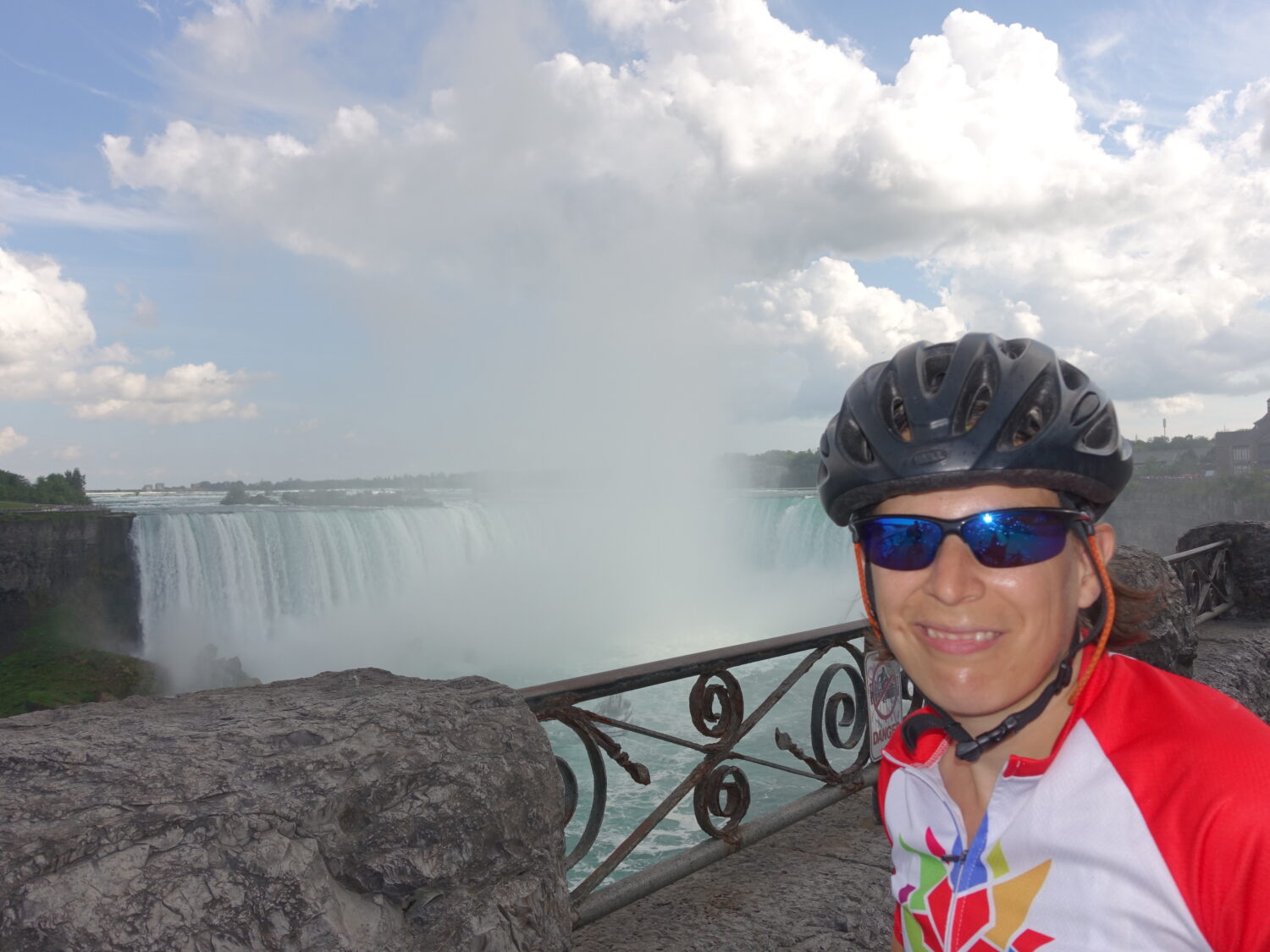 Après l’orage d’hier, on prend le temps de bien déjeuner le matin avant de partir vers Niagara Falls. Sophie est encore un peu zombie avec son sommeil interrompu par le spectacle son et lumière, mais je suis excité d’arriver à destination en espérant avoir plus de waterfront. Passé Port Colbert où nous sommes « obligés » de prendre un crème glacé en attendant le passage d’un bateau de marchandise au pont-levis, nous tombons sur le Friendship trail, une piste multifonction asphaltée de 35 km. Celle-ci n’aide pas l’état mental de Sophie qui la trouve monotone, mais nous atteignons rapidement le bord de l’eau en face de Buffalo. Nous suivons le bord de Niagara River jusqu’aux chutes où nous sommes ralentis par la marée de touristes, mais nous atteignons enfin notre hôtel pour les deux prochains jours. Après nous être reposé, nous prenons le temps d’admirer les chutes éclairées de nuit avant de bénéficier enfin d’un lit.